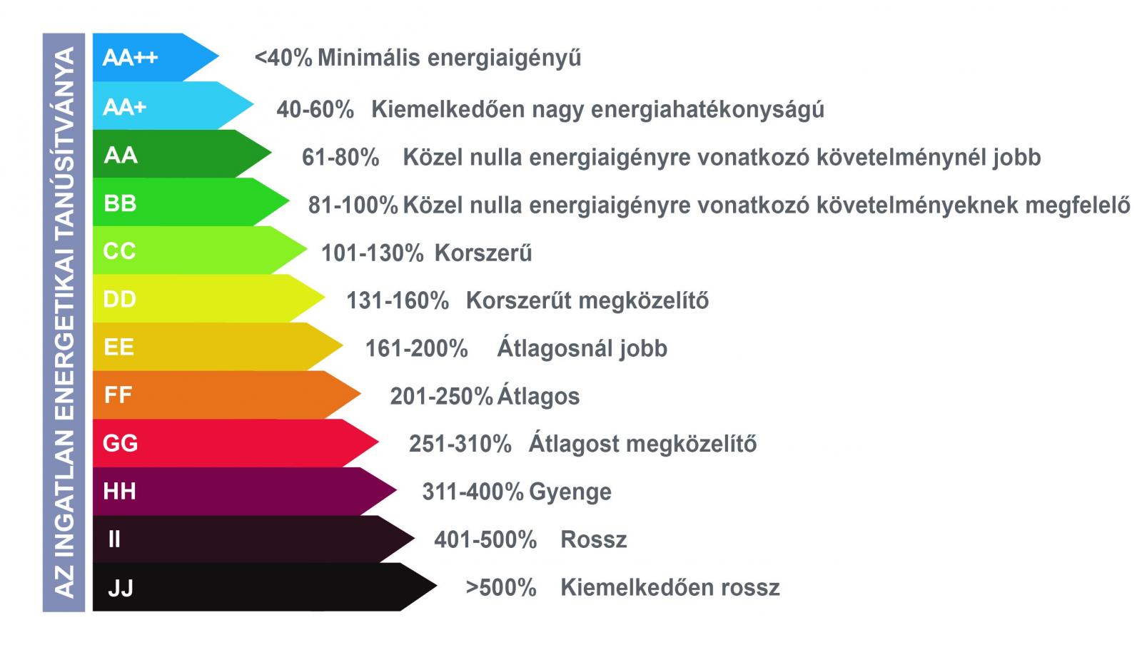 A rendelet az épületek energetikai minőségi osztályozására 10 fokozatot ír elő. A vizsgált épület, illetve önálló rendeltetési egység összesített energetikai jellemzője és a viszonyítási alap arányának százalékban kifejezett értéke alapján az önálló rendeltetési egység minőségi osztályának betűjele és szöveges jellemzése az alábbi táblázat szerinti.